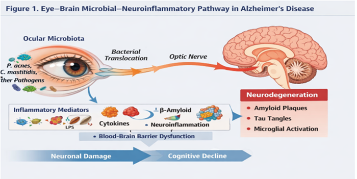 Figure 1: Eye–Brain Microbial–Neuroinflammatory Pathway in Alzheimer’s Disease.
