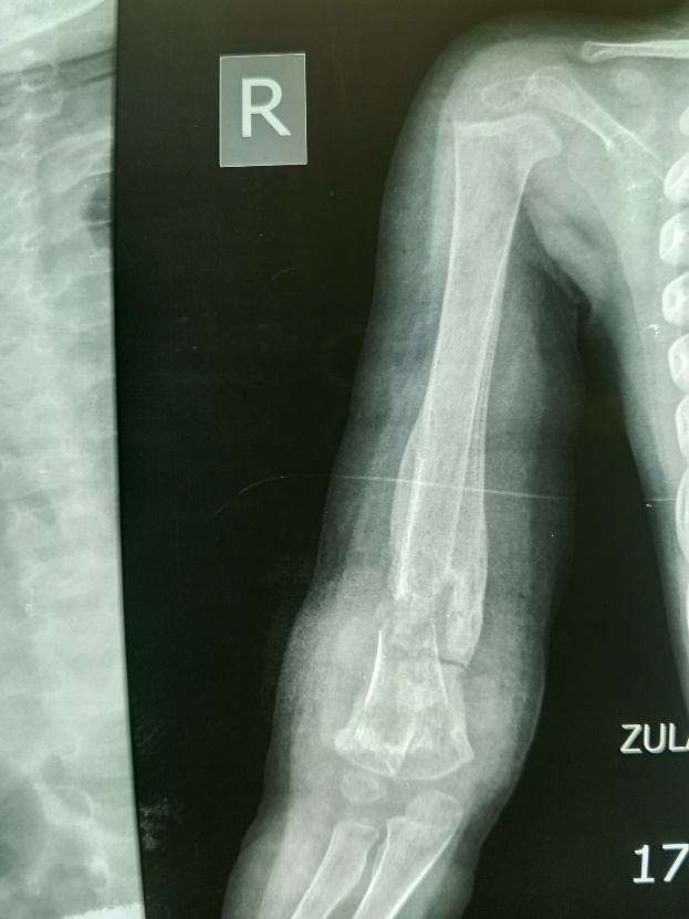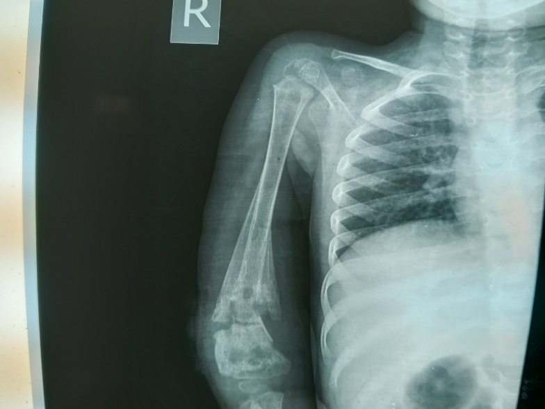 This is a 2-year-old child that had a fall on the right upper limb for more than 4-weeks, presented for plain radiograph of the arm on account of increasing pain, swelling, and persistent fever. He was referred from a peripheral health care centre for plain radiograph of the arm in anterior-posterior and lateral projections.