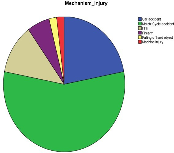 During the period under present study, 200 patients were included. 192 (96%) patients were males and females were 8 (4%) with a male to female ratio of 24:1. Their ages ranged from 13 to 63 years with a mean of 30±12years. Road traffic accident resembling for 156 (78%) of all cases. Of these, 106 (53%) injuries were related to motorcycle accidents affecting passenger’s motorcyclists, and pedestrian.