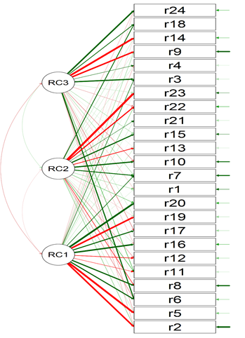 Figure 2 shows the relationships between the three factors reported in the literature with respect to the indicators. Thick and green lines suggest positive and robust relationships. The prevalence of the first factor related to entrepreneurship opportunities is appreciated, and it is related to items 1, 8, 16, 17 and 20. The microfinancing factor was linked to items: 7, 10, 15 and 21. The third factor ausive to innovation was associated with the items: 3, 6, 18 and 24.