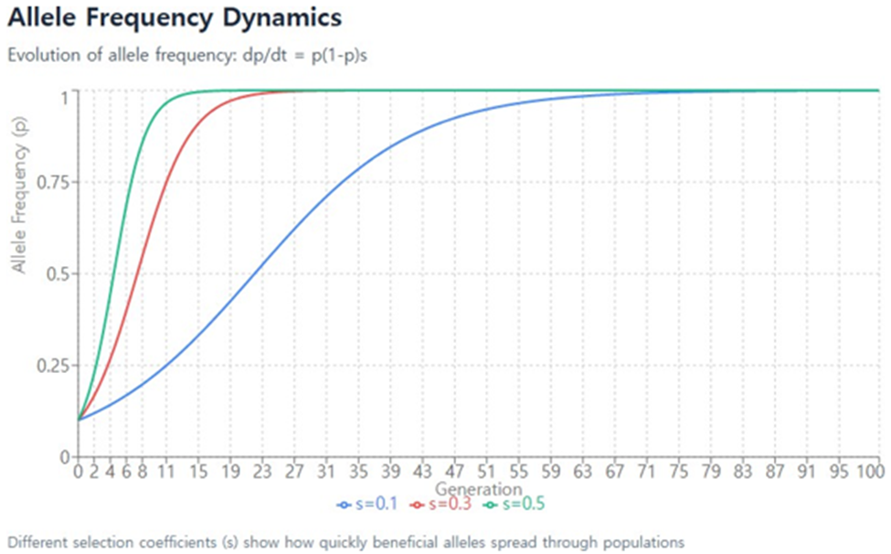 Figure 1: Evolution of allele frequencies over time under different selection coefficients. The graphs show how allele frequencies converge or shift due to evolutionary pressures with varying selection strengths (s=0.1,0.3,0.5). Higher selection coefficients lead to faster fixation of beneficial alleles.