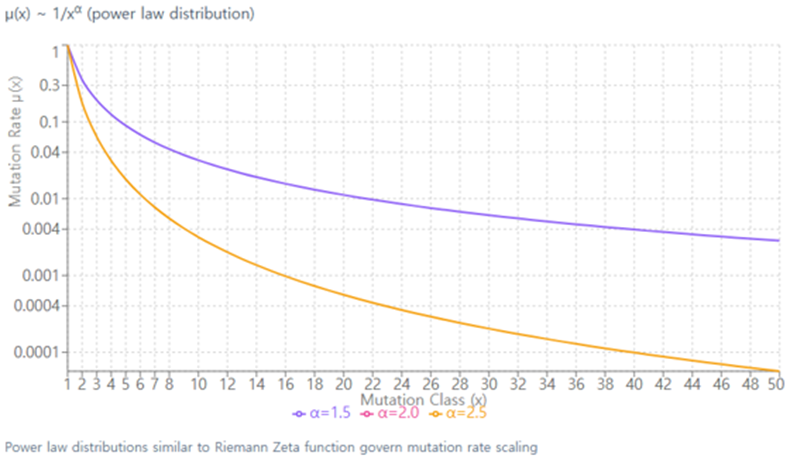 Figure: 2 Mutation rate distribution following power law decay. The distribution μ(x)∼1/xα shows characteristic zeta-like scaling behavior for different values of the scaling exponent α. This illustrates how rare mutations (high x values) occur at frequencies governed by power law distributions S2 Navier-Stokes Equations and Neural Networks the Navier-Stokes equations describe the motion of fluid substances (like air or water) and are fundamental to fluid dynamics. They are expressed as: