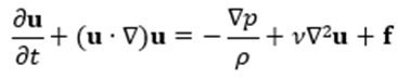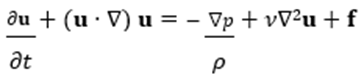 where u is the velocity field of the fluid, p is the pressure, ρ is the density, ν is the kinematic viscosity, and f represents external forces (like gravity).