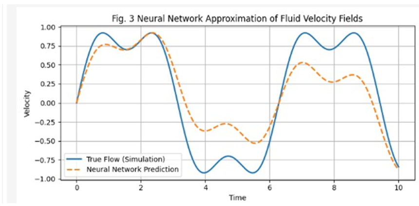 Figure 3: Neural network approximation of fluid velocity fields over time. The comparison between true simulated flow (solid line) and neural network predictions (dashed line) demonstrates the learning process. As training progresses, the network increasingly captures the complex nonlinear dynamics of the Navier-Stokes equations.