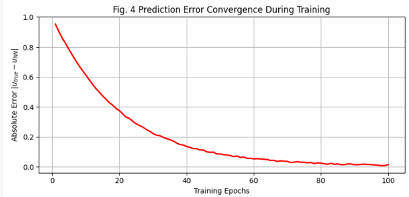 Figure 4: Prediction error convergence during neural network training. The absolute error ∣ utrue− uNN∣ decreases over time as the network learns to approximate the fluid dynamics, showing successful learning of the underlying physics.
