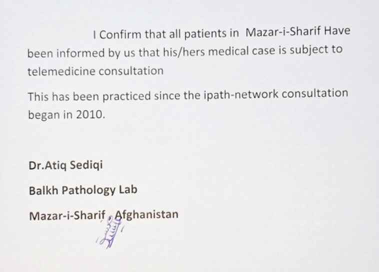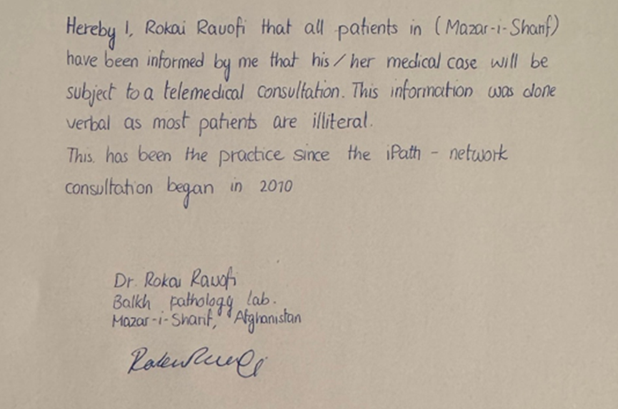 Hereby I Haroon Firooz confirm that all patients in Herat have been informed by us that his/her medical case is subject to telemedicine consultation. This information was done verbal as most patients are illiteral