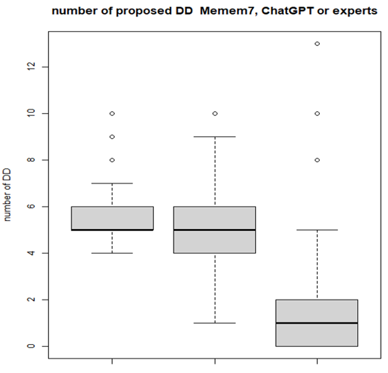 The number of DDs identified by human experts was 1.4 (approximately only 1 DD per case), compared to 5.3 and 5.4 by ChatGPT and Memem7, respectively (see Figure 2). This difference was highly significant (p < 0.00001 in ANOVA). In 88/102 (ChatGPT) or 93/102 (Memem7) of the study cases, a helpful DD list was provided. The DDs suggested by ChatGPT or Memem7 were found to be helpful in (1) finding very rare diseases, (2) confirming one’s own opinion, and (3) extending the list of DDs. Both AI systems performed equally well but generated significantly more DDs than human experts (p < 0.00001).