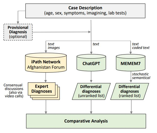 Patients: Data from 102 patients treated for various symptoms and diseases (see Table 1 and Part IV of the Supplement for details) were uploaded to a telemedicine platform (iPath-Network; see Afghanistan Forum below) for disease classification. Cases were randomly selected from 3865 telemedicine consultations conducted from October 1, 2021, to May 31, 2023, in northern Afghanistan. No cases were excluded from the random selection. These telemedicine consultations and classifications were performed by 4 pathologists (GS, PF, CF, PD), one dermatologist (KA), one emergency physician (CF), and one surgeon (RR). Not all experts were present at each case. Cases were uploaded by 3 local Afghan physicians (RR, SA, HF). A brief description of the patient’s age (in years, not birthday) and sex was available, as well as a brief description of the symptoms. In all cases, one or more static images (IPEG format, 1-20 images/case) were available. Histological, cytological, macroscopic, dermatological, and radiological images were uploaded. Computed tomography (CT) and magnetic resonance imaging (MRI) images were uploaded as written reports or as a sequence of images (rare). All cases were documented on iPath-Network. The uploading institutions were 2 private laboratories (Firooz Medical Laboratory, Herat; Balk Hospital, Mazar-e-Sharif) and 1 district hospital (Ibn Sina Hospital, Mazar-e-Sharif). All telemedicine consultations were free of charge. Expert diagnoses were made just in time (less than 3 days), explaining why, in some cases, only 2 experts gave their classification. Each day, all cases were discussed between the attending physician (SA, HF, RR) and the first-line experts (GS, PD, PF, CF, RR, HF). If there was no consensus among the first-line experts, we consulted experts with particular experience in a medical subspecialty, e.g., in bone tumor diseases, hematology, neuropathology, skin pathology, or radiology. Therefore, 3 levels of medical classification of a case were used (see Examples 1 and 2 in the Appendix): [1] the diagnosis of the local doctor in charge of the patient, [2] human experts and their disease classification (level 2 or first line of telemedicine diagnosis), and [3] the opinion of experts in a medical subspecialty if the case required specialist knowledge (level 3 or second line of telemedicine diagnosis). Finally, each case was discussed and concluded with an expert diagnosis or a list of DDs provided by the experts. The exact procedure is described in a flowchart (Figure 1). We presented ChatGPT or Memem7 with the parameters (descriptors) given by the physicians (symptoms, descriptions of images related to microscopy, macroscopy, radiographs, CT, or MRI). All descriptors (parameters) mentioned in the case description were transformed into a Memem7 code (alphanumeric code). The transformation was done by one of the authors (PF; see also Example 1 or 2 in the Appendix). ChatGPT and Memem7 were given the semantic meaning of the Memem7 code. To start ChatGPT and Memem7, we used the same parameters defined for each case (symptoms, image description in the form of macroscopy, microscopy, or descriptions of X-rays, CT, or MRI). The images were transformed into descriptors (string variables) by one of the authors (PF). These descriptors were considered as objects with or without attributes and uploaded to ChatGPT or Memem7 (for examples, see Supplement Cases 1 and 2). For all participants (GP, consultants, Memem7, and ChatGPT), we used exactly the same information (as a string variable or as the sentence “patient has a” for ChatGPT) (see examples in Supplement Cases 1 and 2).The data output was given in string variables (also termed phemes in Memem7) with an unique alphanumeric code.