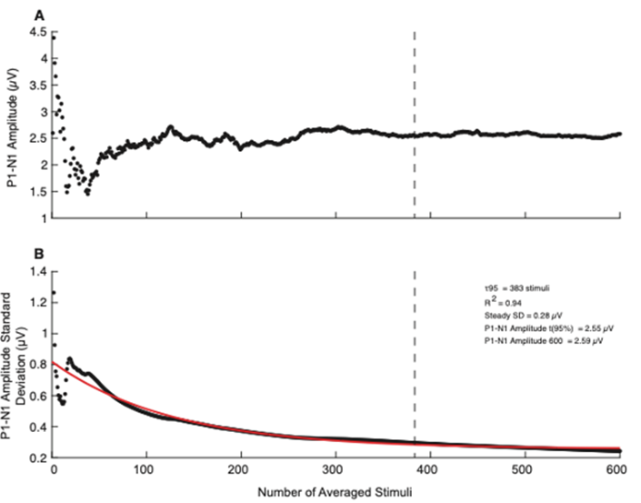Figure 2: Representative example of response stability analysis for pudendal SEPs (P1N1 complex). The cumulative P2P₆₀₀ curve is plotted against the number of averaged stimuli, with the vertical dashed line marking the τ₉₅ stabilization point (A). The standard deviation of P1N1 amplitude across incremental averages with exponential fit is shown below, from which P2Pτ₉₅ is calculated (B).