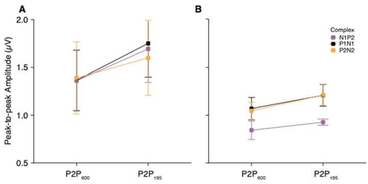 There were no sex-based differences observed for any complex (P1N1 complex: Δ = -0.1, t (32.5) = 0.6, p = 1.0, d = 0.2); N1P2 complex: Δ = -0.2, t (27) = 1.1, p = 0.8, d = 0.4); P2N2 complex: Δ = -0.1, t (29.7) = 0.4, p = 1.0, d = 0.1), all showing comparable peak-to-peak amplitudes between females and males.