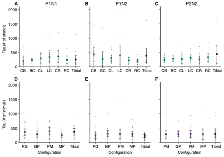 We also explored the response stability of pudendal SEP responses compared to that of tibial SEP responses by paired t-tests to evaluate differences in τ95 across stimulation sites for each complex. Only trials where τ95 ≤ 2048 stimuli were included in this analysis. To correct for multiple comparisons across the different complexes, we used a Bonferroni-adjusted of 0.017 (0.05/3). To evaluate the reliability of the pudendal SEP procedure, we conducted a test-retest analysis on the latencies and peak-to-peak amplitudes. We averaged waveform observations across configurations to ensure each participant contributed one set of paired data per measure. To determine the reliability of latencies and amplitudes between an initial test and retest, we used an absolute-agreement, single-measure two-way mixed-effect intraclass coefficient (ICC3,1) model. We interpreted ICC results via reference to conservative ratings presented by Koo and Li (2016). Bland-Altman confidence values and limits of agreement (mean difference ± 2SD) were calculated, and the mean differences tested against 0 (one-sample t-test) to evaluate bias between sessions (Bland & Altman, 1986).