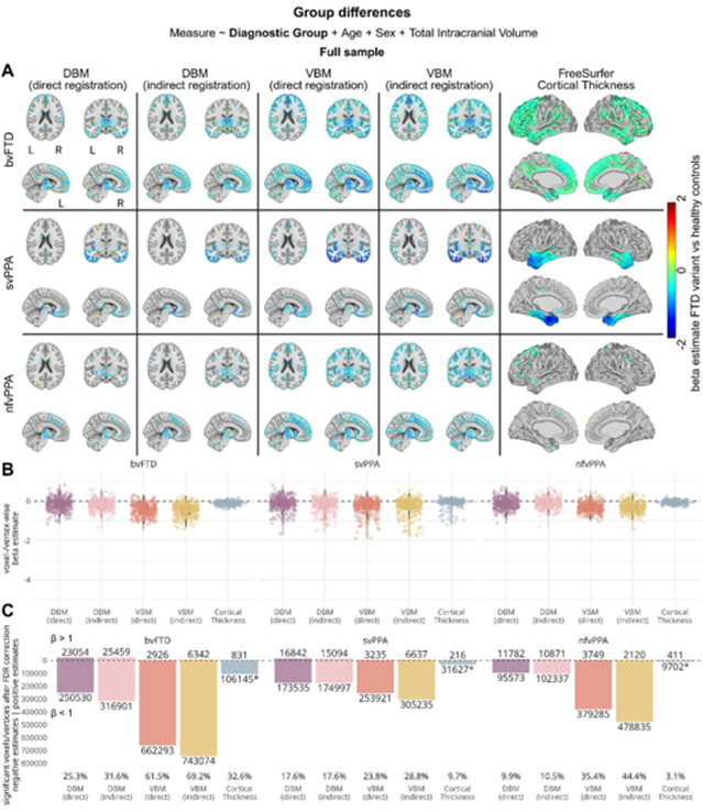 Figure 4: Results of linear regression models assessing the sensitivity of each method to detect differences between FTD subtypes and healthy controls in the subset of MRI scans that were successfully processed by each method. A) Brain maps showing beta estimates for the main effect for diagnostic group, comparing regional values for FTD variants versus healthy controls. B) Box- and violin plots summarizing beta estimates for the group effect for each method. Each datapoint represents the estimate for one atlas region. C) Barplots showing the number of regions with significant group differences, after FDR correction, divided by direction of the effect. Percentages of significant regions out of all atlas regions, regardless of effect direction, are shown below each bar. *Note that Cortical Thickness is only calculated for 62 of 90 regions, as this measure does not include subcortical areas. VBM: Voxel-Based Morphometry, DBM: Deformation-Based Morphometry, by FTD: behavioral-variant Frontotemporal Dementia, svPPA: semantic-variant Primary Progressive Aphasia, nfvPPA: nonfluent-variant Primary Progressive Aphasia.