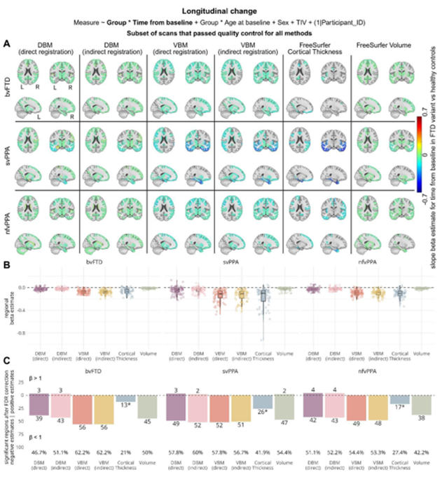 FTLDNI MRI and clinical measures are available through https://ida.loni.usc.edu/login.jsp. PELICAN and FreeSurfer are available at https://github.com/VANDAlab/Preprocessing_Pipeline and https://surfer.nmr.mgh.harvard.edu/, respectively. Codes used for analysis are available on GitHub (https://github.com/ameliemetz/FTD_methods_comparison). Regional and voxel-/vertex-wise results are available for download under https://zenodo.org/records/17516941.