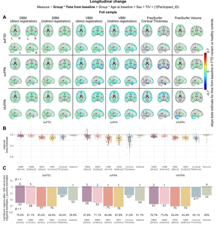 Figure 8: Results of linear mixed-effects models assessing the sensitivity of each method to detect longitudinal changes between FTD subtypes and healthy controls in the subset of MRI scans that were successfully processed by each method. A) Brain maps showing beta estimates for the interaction between diagnostic group and time from baseline, comparing regional slopes for FTD variants versus healthy controls. B) Box- and violin plots summarizing beta estimates for the interaction effect for each method. Each datapoint represents the estimate for one atlas region. C) Barplots showing the number of regions with significant slope differences, after FDR correction, divided by direction of the effect. Percentages of significant regions out of all atlas regions, regardless of effect direction, are shown below each bar. *Note that Cortical Thickness is only calculated for 62 of 90 regions, as this measure does not include subcortical areas. VBM: Voxel-Based Morphometry, DBM: Deformation-Based Morphometry, bvFTD: behavioral-variant Frontotemporal Dementia, svPPA: semantic-variant Primary Progressive Aphasia, nfvPPA: nonfluent-variant Primary Progressive Aphasia.