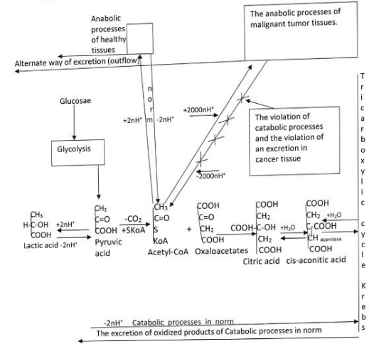 The mechanism maintenance stability Internal Energy (U) (stable temperature 36,0ºC -36,9ºC, stable PH = 7,35 in blood etc.) is depended on interactions between Internal Work (Wint) of an organism and External Work (Wext) of an organism which creates maintenance stability of organism’s Internal Medium (stable concentration substances in blood and neurolymph). The stability Internal Energy (U) support stable balance anabolic endergonic processes & catabolic exergonic processes of an organism (Figure 1). It contains three level regulation: highest level regulation [Central Nervous System], high level regulation [“Equilibrium Constant of ionic metabolism”, “Equilibrium Constant of acid –- alkaline metabolism”, “Equilibrium Constant of oxidative-reduction Potentials of metabolism” and “Equilibrium Constant of coagulating system of blood”] and low level regulation [“Equilibrium Constant of endergonic and exergonic processes of energy exchanges” and “Equilibrium Constant of anabolic and catabolic processes of metabolism”] (1. 2) (Figure 2). The mechanism maintenance stability Internal Energy (U) (temperature 36,0ºC-36,9ºC, by which all enzymes operate etc.) and Internal Medium (constant concentrations of substances in blood and in neurolymph) of an organism are also formed under the influences of interactions between mechanism maintenance stability Internal Energy (U) of both an organism and all cells of an organism. Just mechanism maintenance stability Internal Energy (U) of an organism determines stability Stationary State of an organism (1, 2). The affection of cells by v-oncogenes results in shift balance anabolic endergonic processes & catabolic exergonic processes into excessive anabolic endergonic processes. Excessive anabolic endergonic processes of cancer disease lead to excessive consumption energy via Acetyl–CoA for anabolic biosynthetic endergonic processes in cancer tissue which cause the overload of “nodal point of bifurcation anabolic and catabolic processes” [NPBac] because of the remained lack Acetyl–CoA for oxidative phosphorilation in catabolic exergonic anaerobic processes of Krebs tricarbonic acids cycle (TCA) (3. 4. 5. 6) (Figure 3). Also such shift into excessive anabolic endergonic processes and lack Acetyl-CoA cause partial suppression of catabolic anaerobic exergonic processes of oxidative phosphorilation (TCA) in cancer tissue, but some catabolic anaerobic processes remain for cancer cells survival (3. 4. 5. 6) (Figure 3). The increase of lactic acids production is the necessary mechanism of accumulation energy for huge anabolic endergonic processes in condition glycolysis metabolism which cause enormous consumption energy for anabolic processes in cancer tissue (3, 4, 5, 6) (Figure 1 and Figure 3). Thus, Warburg effect mechanism is formed oncogenesis of the metabolism of cancer tissue (3, 4). The partial suppression of catabolic anaerobic processes causes shift balance catabolic aerobic exergonic processes & catabolic anaerobic exergonic processes into prevailing catabolic aerobic exergonic oxidative processes (3, 4, 5, 6) (Figure 1 and Figure 3). The considerably increased Lactic Acids, as the marker of Glycolysis, and prevailing Aerobic catabolic exergonic oxidative processes determine “Aerobic Glycolysis” of Warburg effect in cancer metabolism (3, 4, 5, 6) (Figure 3).