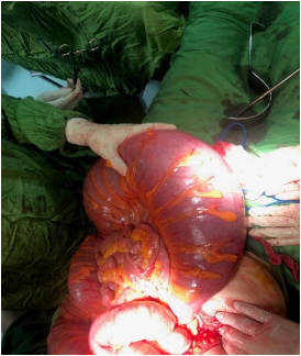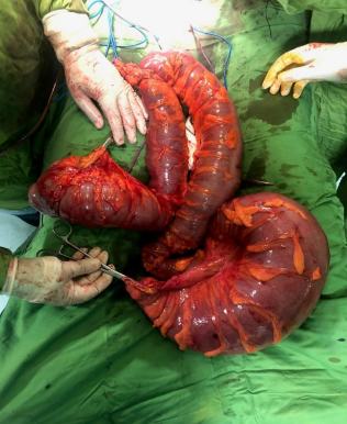 Our case was a 52 years old female with history of recurrent and transient abdomibal distention for 10 days in every months. She referred to Surgery parts and we start examinations and lab data’s. She has 6200/ml WBC, no fever, no nausea and no vomiting. She has good and healthy appearance and in abdominal examination she has distention synchronized in abdomen, no scar of surgery, no colorless and no tenderness. We perform a triple CT for her and we find 2 Simultaneous separated in cecal and transverse colon volvulus that in surgey we find them (figure1), with this information we programing a surgery for her. In Laparatomy we find transverse colon volvulus (figure 2) and we decide to do total colectomy (Figure 3). It shows she has 3 years Chronic Simultaneous separated triple large bowel volvulus (Figure3).