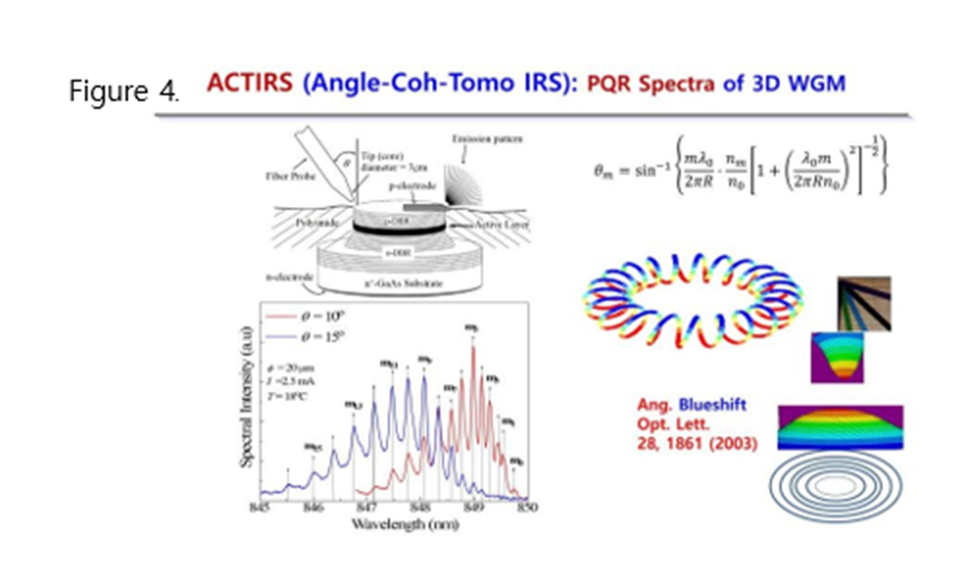 We show a non-invasive brain/breast diagnostic site by means of microscopic angle- resolved coherent tomographic infrared spectroscopy (ACTIRS),with ultra-low threshold current 3D photonic quantum ring (PQR) laser devices, while creating unexpected 3D blue-shift spectra from CW/CCW helical standing wave propagation within the PQR's ‘self-born’ resonanttoroidal cavity. We note that London’s St. Paul dome is famousas 2D whispering gallery (WG), below which is the first 2D WG laser, made by AT&T (1992), as shown in Figure 1 (left). Next, Figure 1 (right) shows the Baptistery of St. John in Pisa, whose dome would allow 3D whispering cave mode (WCM) instead, an ideal example for the 3D PQR laser of resonant double helix.