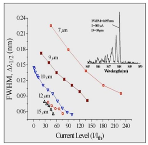 Figure 5-deviceshows a collection of linewidthdata being almostinversely proportional to the device size as expected. The narrowest linewidth observed with an optical spectrum analyzerto date from a 10 µm PQR is 0.55 Å at an injection currentof 800 µA. We also note that with wet etching steps employed instead of dry etching, the Q factor reached up to 20,000 while the linewidth approached 0.4 Å.