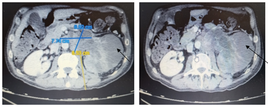 A 70-year-old male patient, no past medical history. He presented to the Emergency Department with left flank abdominal pain radiating to the left inguinal region, gross haematuria, urinary discomfort and a low-grade fever of 1 month’s duration. During physical exploration a hard and painful mass is palpable in the left lumbar fossa and left abdominal flank. Soft abdomen, no signs of peritoneal irritation. Blood test showed alterations of acute phase reactants: leukocytosis 22000/ mm 3, C-reactive Protein (CRP) 6.93 mg/dL, no decline in renal function. Renal ultrasound scan was requested (Figure. 1): the left kidney (LK) showed signs of hydronephrosis with dense content in the urinary tract at the proximal pyeloureteral junction, of possible tumorous type (urothelioma). The renal pelvis measures 32 mm. Multiple left paraaortic and locally associated adenopathies were noted. The right kidney (RK) had normal morphology, no urinary tract dilatation. The bladder was poorly distended, without evidence of internal lesions. The prostate was increased in size.