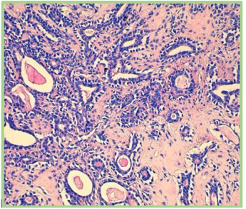 Figure 4: (HE*40) High-grade infiltrating adenoid cystic carcinoma of the parotid gland in a 70-year-old patient.