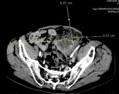 Figure 1: Transverse section of abdominopelvic CT, with abscess measuring 4'87x3'51cm