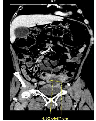 Figure 2: Coronal section of abdominopelvic CT, with abscess measuring 4.5 x 4.87 cm