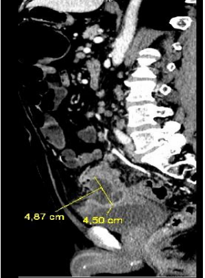 Figure 3: Sagittal section of abdominopelvic CT, with abscess measuring 4.87 x 4.5 cm