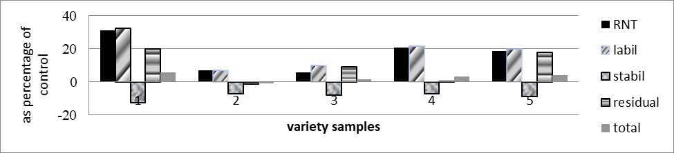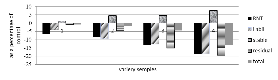 In cotton genotypes characterized by stress depression of seed germination in a saline solution, a decrease in the synthesis of RNA, total and labile DNA is observed in comparison with control plants (Table.2). Moreover, the more sensitive the plant was to salinity, the greater the decrease in RNA, total and labile DNA synthesis was. For example, stress depression of seed germination under salinity in variety 741 was 15%, depression of labile DNA synthesis in experimental plants, compared to the control, was 9.5%. In variety C-6040-1, depression of seed germination under stress was 49.2%, depression of labile DNA synthesis was 18.6%. At the same time, this process was accompanied by an increase in the amount of stable DNA (figure 3).