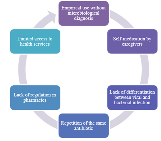 An inaccurate clinical diagnosis can also lead to the inappropriate use of antibiotics, with many viral infections, such as adenovirus or rhinovirus pharyngitis, being incorrectly treated with antibiotics due to a lack of rapid tests or pressure from caregivers. In the current context, this type of practice is not only ineffective but also promotes the development of resistance in the patient's commensal microbiota. A critical issue is the repeated use of the same antibiotic to treat clinical conditions with different characteristics or etiologies. What exacerbates the problem is its common use in pediatric outpatient care, without considering the potential for changes in bacterial sensitivity or the pharmacodynamics of the medications. This leads to therapeutic failures, prolonged symptoms, and an increased risk of complications (Caicedo et al., 2024). In areas with limited access to healthcare services, the problem of resistance is even more acute because the lack of microbiological diagnosis, self-medication, and weak pharmaceutical regulation contribute to the selection of multidrug-resistant bacteria. This poses a significant challenge for public health systems, as these populations lack effective alternatives. Finally, the use of antibiotics prescribed by unqualified personnel, such as some pharmacists or pharmacy assistants, is a common practice in various countries, including regions of Latin America; this phenomenon, driven by the lack of access to medical care and the demand for quick solutions, promotes inappropriate treatments that reinforce bacterial resistance, which, in many of these cases, do not follow therapeutic guidelines or consider factors such as weight, age or allergies of the patient (Caicedo et al., 2024).