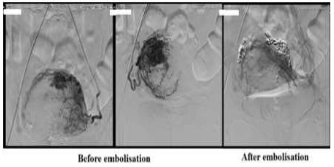 Figure 3: Digital subtraction angiography (DSA) showing bilateral hypertrophy of uterine arteries that feed a tortuous, hypertrophic arterial mass with capillary lakes and post uterine AVM embolization film demonstrating successful embolization of the feeding vessels of AVM with the help of N-butyl cyanoacrylate (glue). Reproduced from: [16] Shintre H S, Coelho K S. Managing Uterine Arteriovenous Malformation (AVM) Is Like Dealing With Raging Wildfire Awaiting A Spark: Better Be Extremely Cautious & Be Ready With Counter Measures Like Uterine Artery Embolization (UAE). Obstet. Gynecol. Int. J. 2017; 6(1): 00195 DOI: 10.15406/ogij:2017.06.00195