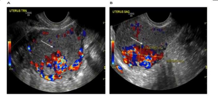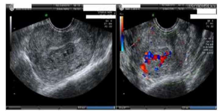 Figure 4: After 6 weeks of uterine AVM embolization, USG-pelvis revealed diminished size of AVM (1.3cm x 1.7 cm x 1,5 cm) with diminished vascularity on Doppler. Reproduced from: [16] Shintre H S, Coelho K S. Managing Uterine Arteriovenous Malformation (AVM) Is Like Dealing With Raging Wildfire Awaiting A Spark: Better Be Extremely Cautious & Be Ready With Counter Measures Like Uterine Artery Embolization (UAE). Obstet. Gynecol. Int. J. 2017; 6(1): 00195 DOI: 10.15406/ogij:2017.06.00195