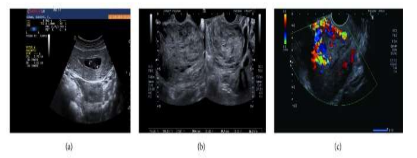 Figure 5: (a) Ultrasound image just before D/C shows 9-week foetus with no cardiac activity and there is no sign of uterine AVM. (b) Sagittal endo-vaginal image of the uterus shows 60 x 60 x 56 mm (103 cm3) hyper-echogenic and heterogeneous mass lesion located in the anterior wall of the uterus and extending laterally at the left. (c) Colour Doppler image shows multiple tortuous vessels. Reproduced from: [1] Karadag B, Erol O, Ozdemir O, Uysal A, Alparslan AS, Gurses C, Koroglu M. Successful Treatment of Uterine Arteriovenous Malformation due to Uterine Trauma. Case Rep Obstet Gynecol. 2016;2016:1890650. doi: 10.1155/2016/1890650. Epub 2016 Sep 6. PMID: 27699074; PMCID: PMC5028872. https://pubmed.ncbi.nlm.nih.gov/27699074/ ] under the Creative Commons Attribution License.