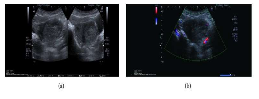 Figure 7: A repeat trans-vaginal ultrasound and Colour Doppler done two months later; (a) the lesion was measuring 61 x 46 x 52 mm (77 cm3) and (b) revealed no blood flow. Reproduced from: [1] Karadag B, Erol O, Ozdemir O, Uysal A, Alparslan AS, Gurses C, Koroglu M. Successful Treatment of Uterine Arteriovenous Malformation due to Uterine Trauma. Case Rep Obstet Gynecol. 2016;2016:1890650. doi: 10.1155/2016/1890650. Epub 2016 Sep 6. PMID: 27699074; PMCID: PMC5028872. https://pubmed.ncbi.nlm.nih.gov/27699074/ ] under the Creative Commons Attribution License.
