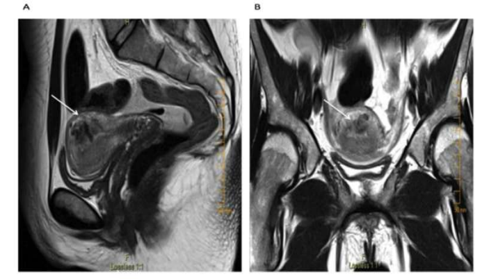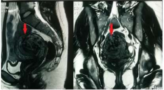 MRI pelvis-sagittal and transverse section-showing bulky uterus with 4 x 7 x 7 cm sized heterogeneous lesion seen in posterior wall, lost endometrial-myometrial interface, multiple dilated tortuous blood vessels in posterior myometrium & tiny enhancing area within the endometrium in lower uterine segment. Reproduced from: [16] Shintre H S, Coelho K S. Managing Uterine Arteriovenous Malformation (AVM) Is Like Dealing with Raging Wildfire Awaiting A Spark: Better Be Extremely Cautious & Be Ready with Counter Measures Like Uterine Artery Embolization (UAE). Obstet. Gynecol. Int. J. 2017; 6(1): 00195 DOI: 10.15406/ogij:2017.06.00195