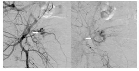 Selective angiography in cases of AVMU does demonstrate AVMU and based upon confirmation of the AVMU embolization of the AVMU tends to be undertaken under local anaesthesia which tends quite often to stop the bleeding from the AVMU. In cases of large AVMUs, the size of the AVMU would typically reduce and there may be residual AVMUs. Recurrences of AVMUs could develop subsequently in some cases of AVMU.