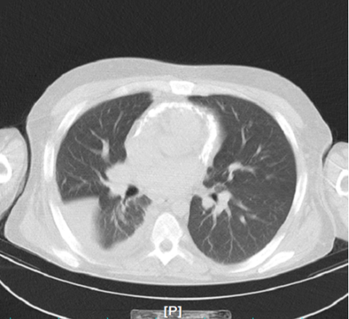 with mild hepatomegaly noted on physical examination. Besides hypotension, the patient did not complain of any cardiac, vascular, or chest pain symptoms. Given the presentation of mild dyspnea and hypotension, a chest CT scan was performed to investigate for COVID-19, which did not show any signs of lung tissue involvement but reported calcification of the pericardial wall (figure.1).