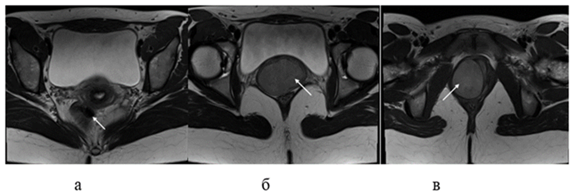 Figure 2: MRI images of axial sections of the small pelvis: a – level of the cervix; b – level of the first formation; c – level of the second formation.