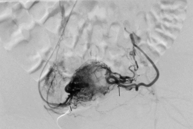 Surgical treatment included sequential endovascular procedures and surgical removal of the tumor.