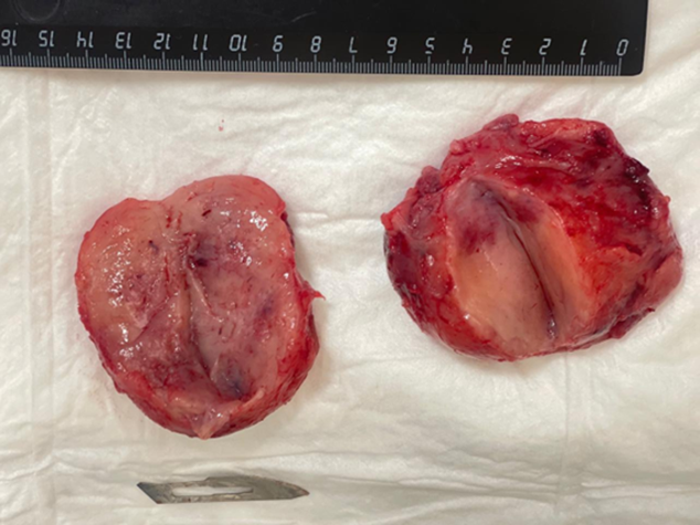Description of the specimen: 1) two formations of soft-elastic consistency, without signs of decay, 5x5 cm and 6x6 cm in diameter (Fig. 7); 2) capsule of cystic formation measuring 3x2x2 cm.