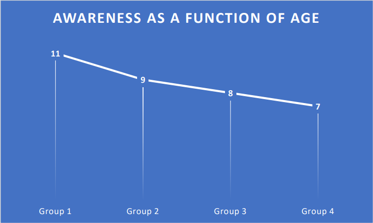 Though dementia is considered to be degenerative and is irreversible in nature. Early identification is the key of effective intervention even in dementia. Hence awareness becomes the key for effective identification and intervention of dementia. The awareness is found to vary as a function of age, gender and educational status of the individuals (Chung, 20000. Older individuals are expected to know more about dementia compared to younger individuals as they are bound to visit hospitals and doctors who may sensitise these individuals. There is contradicting evidence on the same which reflects better awareness in younger individuals as they are inclined towards social media and reading which may increase their awareness pertaining to the same (Whear et al, 2014).
