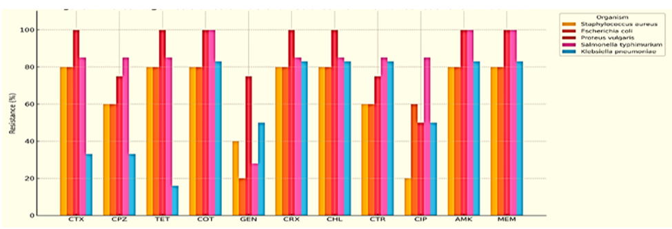 Percentage resistance patterns of bacterial isolates against commercial antibiotics, showing varying resistance profiles across species. High resistance was observed particularly in Proteus vulgaris and Salmonella typhimurium, notably against ceftriaxone, amikacin and meropenem, indicating the presence of multidrug-resistant strains in herbal preparation