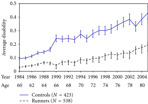 Figure 1: Study between athletes (runners) and a control group who did not participate in sports. Both groups were monitored during the final period of their lives to determine what level they could maintain and how healthy they remained.
