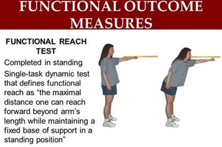 Figure 3: Reaching forward in a standing position requires a certain amount of control, and this control partly determines the distance that can be reached. By reaching along a measuring stick, one can immediately see the achieved distance. By conducting many tests at all ages, an average value emerges that can serve as a standard. This made it possible to identify people who were vulnerable and would decline fairly quickly. Reduced ability to reach has shown increases in future falls with odds ratios of 8.2 if unable to reach at all and 4 if able to reach < 5>