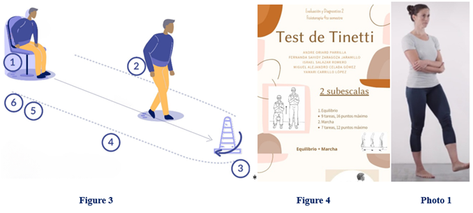 Figure 3, 4, and Photo 1: Up and Go test, Test de Tinetti, one leg standing with at the top with closed eyes [17-22].
