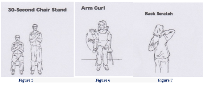 Figure 5: Standing up as fast as possible in 30 seconds. Figure 6: Bend the elbow with a weight as much as possible.