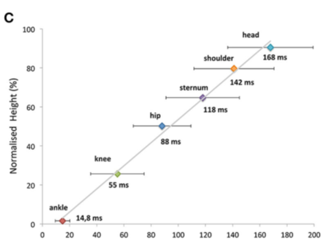 Figure 14: This figure shows how the information about weight change is transmitted from bottom to top, and the times are indicated when the information and reaction reach the specific points. The weight shift and especially the perception under the feet are therefore essential information for this system, so testing that input is essential.