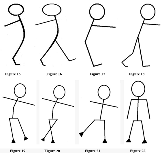 Figure (15 -22): At or beyond the boundary, a reaction is required in trunk and fee. Falling forward: trunk backward and on the toes. Falling backward; trunk forward and forefeet up. Falling sideways; an elongation in the trunk/hip beyond the lateral limit of the foot. These actions are necessary to gain time for a weight shift to one leg. Falling forward: place free leg to the forward, backward fall free leg to the back, and sideways, cross and then shorten trunk/hip to place the free leg far outside. Here we see the first problems in the adaptation process due to various changes in body and muscle patterns. This element, which is fundamental for optimal balance control, will never be clearly revealed in all balance tests.