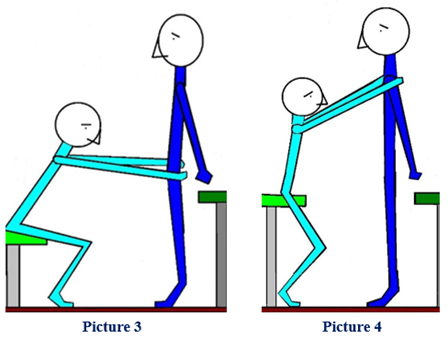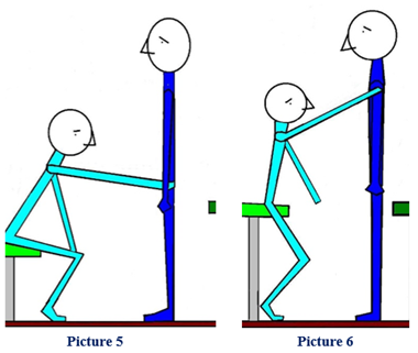 Picture 1 and 2: “Statiek technique” at the front at hip and shoulder height. To keep the situation safe, there is a table behind, yet this can again have a disadvantage because sometimes people focus too much on it. Of course, this can also be done by the therapist in a standing position, but from a seated position it often provides more safety.