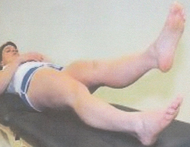Does the reaction increase properly and are there indications that measures are taken when the limit reached? Reaction for: dorsiflexion of both feet (is it the same in terms of time, speed, and strength) and simultaneously flexion in the trunk n (left and right equally fast and equally far), furthermore at the limit there is a weight shift to one leg and is it always the same leg. And is the stepping strategy optimal. Reaction behind: plantar flexion and trunk/hip extension, and what is the reaction at the end and is the stepping strategy optimal. The phenomena that a reaction to light pressure can be addressed with an optimal “board” response, but any hesitation is a sign that something is functioning less well somewhere, which can be in detection and/pr response. Through repetition, it is also possible to feel whether the person has reserve and improves their reaction, or if there is clearly something missing. For example, if one leg is consistently later or too late, this can be a sign of a joint problem, incomplete muscle pattern, leg length difference, or pathological tone. A consistently delayed but still good “board” reaction may indicate a perception problem. The “brake” reaction at the limit, if there are differences, calls for further investigation of, among other things, muscle pattern and tone. Pathological tone often does not seem to test task-specific, but test (photo 3) provides best insight.