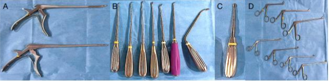Figure 5 : A: Kerrison punch ; B: curets; C: Indian knife, D: Pituitary rongeurs.